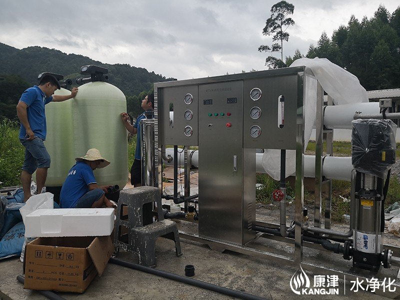 本月初在上林養殖場完工一臺純凈水直飲設備,該設備采用高品質反滲透膜技術、優質304不銹鋼管路、不銹鋼過濾罐體、PLC微電腦控制系統、PLC簡易觸屏控制面板。整套直飲水設備的過濾流程為山泉水→原水箱→原水泵→石英砂過濾器→活性炭過濾器→(阻垢劑加藥裝置)→保安過濾器→高壓泵→反滲透裝置