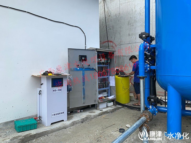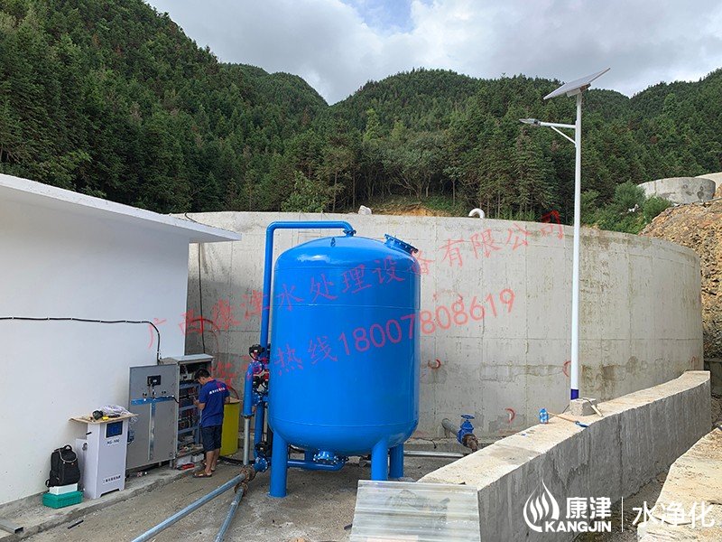 工藝流程:山泉水-絮凝投加器-石英砂過濾器-二氧化氯加藥器-用水點