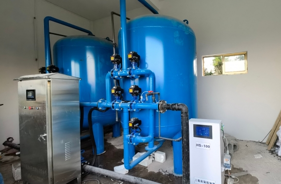 工藝流程:河水-石英砂過(guò)濾器(二級(jí)過(guò)濾)-二氧化氯消毒