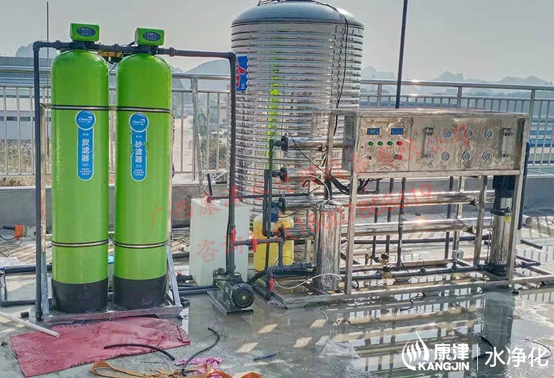 工藝流程:原水箱-原水泵-石英砂過濾器-活性炭過濾器-精密過濾器-反滲透設(shè)備-凈水箱